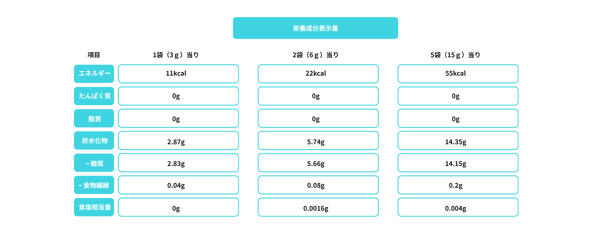 1袋(3g)当り…2.21g、2袋(6g)当り…4.42g、5袋(15g)当り…11.05g